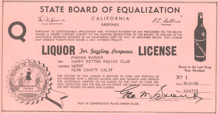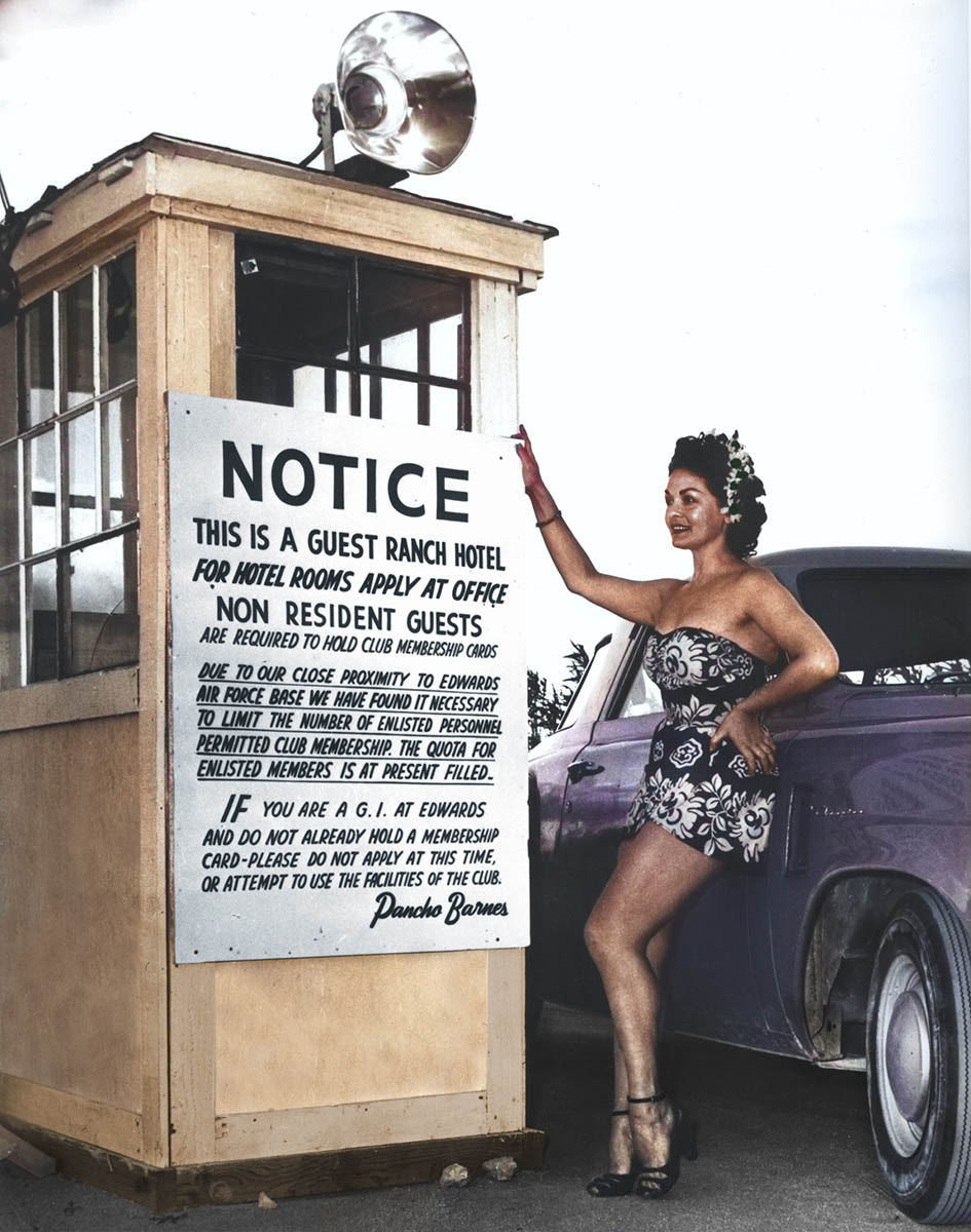 The Happy Bottom Riding Club was Pancho Barnes most famous and successful creation. Club members could fly in to Pancho’s FAA approved airport, attend rodeos at her championship rodeo stadium, ride horses from her well-stocked horse corral, dance in her dance hall, have drinks at her bar, eat the best steak of their life in her restaurant, swim in her large circular pool, and then decide to do it all again the next day by checking into her hotel. Additionally, on her 360 acre ranch, she had a thriving dairy, cattle and hog business. During the height of the Happy Bottom Riding Club’s success, there were over 9,000 members worldwide. You never knew who would show up at the Club for a steak dinner, sit in with the jazz combo, or sing with the other customers at the piano bar. It was not unusual to find heads of state, high ranking military, actors, actresses, famous writers and artists, and perhaps even your next door neighbor at Pancho’s bar and restaurant. At Pancho’s, everyone who liked to enjoy life, laugh and have a good time was welcomed. Pancho was fond of saying, “When you have a choice choose happy!” Well, when you went through the door of her club, it was quite clear that you had chosen the happy path for the evening!